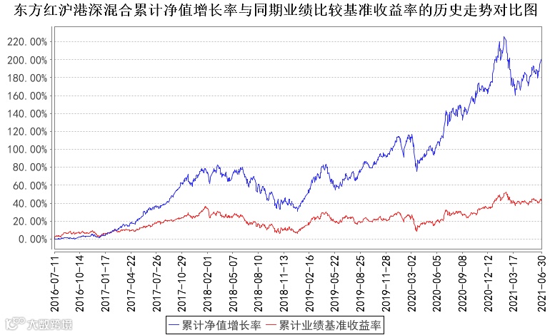 注2:数据来源东方红沪港深混合基金2021年中报,截至2021年6月30日。东方红沪港深混合基金2016年、2017年、2018年、2019年和2020年份额净值增长率分别为3%、66.6%、-21.15%、51.44%和38.65%,同期业绩比较基准收益率分别为4.03%、21.53%、-14.62%、17.9%和9.33%。业绩比较基准为:沪深300指数×40% +恒生指数×40% +中国债券总指数收益率×20%。东方红沪港深混合历任基金经理:林鹏(2016、07、11-2020、05、16)、刚登峰(2018、04、20—2021、04、21)、秦绪文(2018、04、20至今)、周杨(2020、11、06至今)。