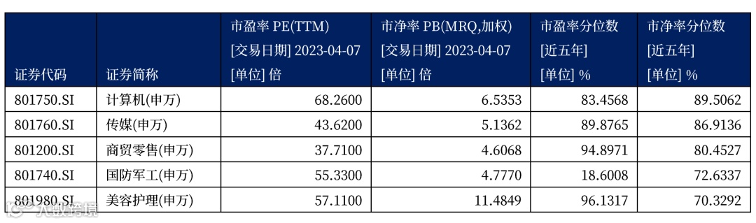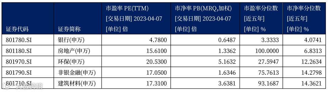 表一:申万一级行业市净率分位数前五行业