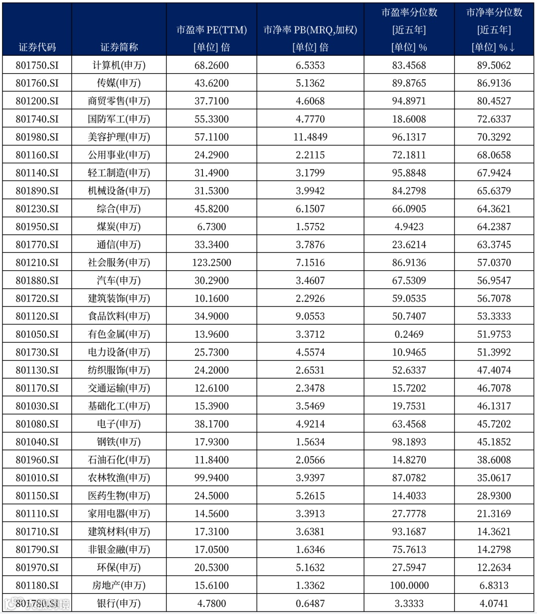 表二:申万一级行业市净率分位数后五行业