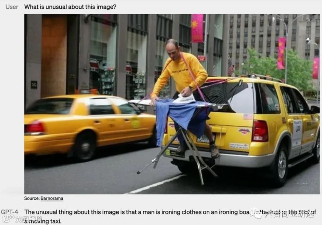 GPT-4强大到什么程度?工作人员输入一张手绘的草图,GPT-4能直接生成最终设计的网页代码。它以高分通过各种标准化考试:SAT拿下700分,GRE几乎满分。以美国律师入门考试为例,之前的GPT-3.5排名在倒数10%左右,而GPT-4考到前5%左右。GPT-4还能描述照片、看懂图表、解答论文,用户问这张图片有什么不寻常之处时,GPT-4简练回答,此人正在行驶中的出租车车顶上熨烫衣服。