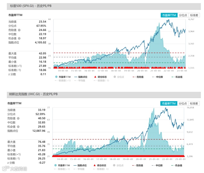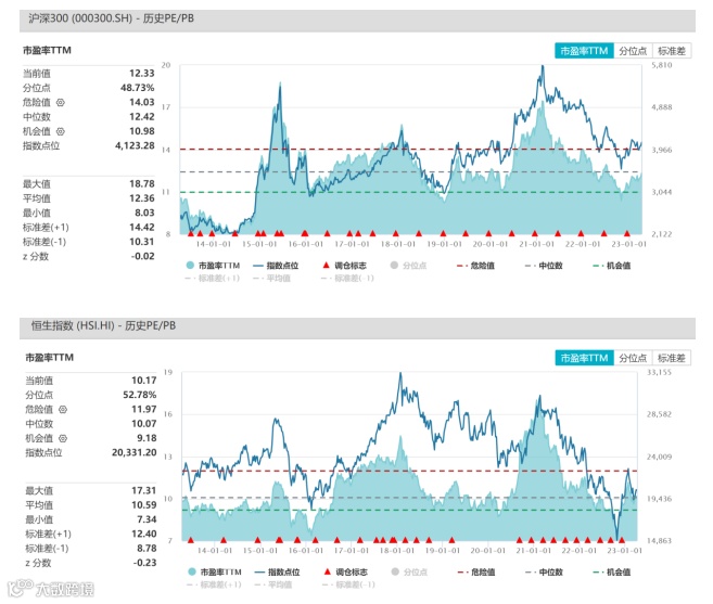 (1)从市盈率角度看:A股的沪深300指数PE12.33倍、港股的恒生指数PE10.17倍,分别处于近十年48.73%和52.78%的历史分位;而美股的标普500指数PE23.54倍、纳斯达克指数PE33.19倍,分别处于近十年67.95%和52.59%的历史分位。