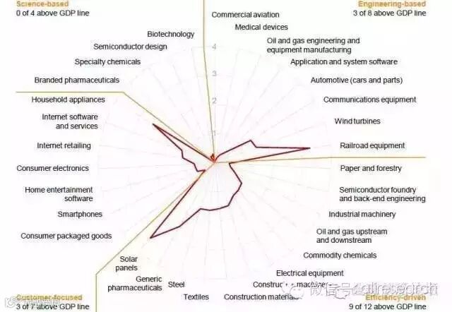 中国的企业还没有在我们分析的科学行业里,占有以上提及的GDP份额(我们所分析的行业包括化学品、半导体设计和制药等)。尽管中国对技术能力的投入很大,但是收效甚微。