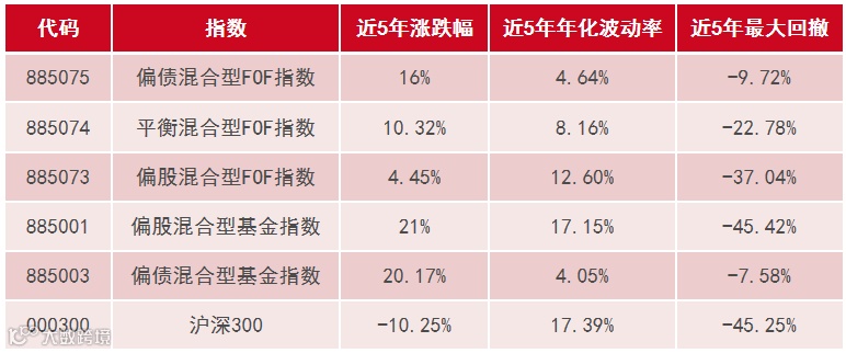 从近五年的收益和波动情况来看,FOF基金通过有效的资产配置,有效地降低了波动和回撤。而偏债混合型FOF在近五年来不仅在波动和回撤上更可控,指数同时也收获了相对理想的收益。