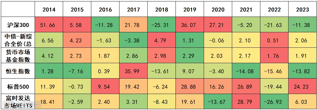 数据来源:Wind, 数据区间2014.1.1-2023.12.31,(各指数代码为,沪深300:000300;中债-新综合全价(总值)指数:CBA00103.CS;货币市场基金指数:885009.WI;恒生指数:HSI.HI;标普500:SPX.GI;富时发达市场REITS:ERGLU.FI)。指数数据仅供参考,不代表未来表现或本基金的收益情况。