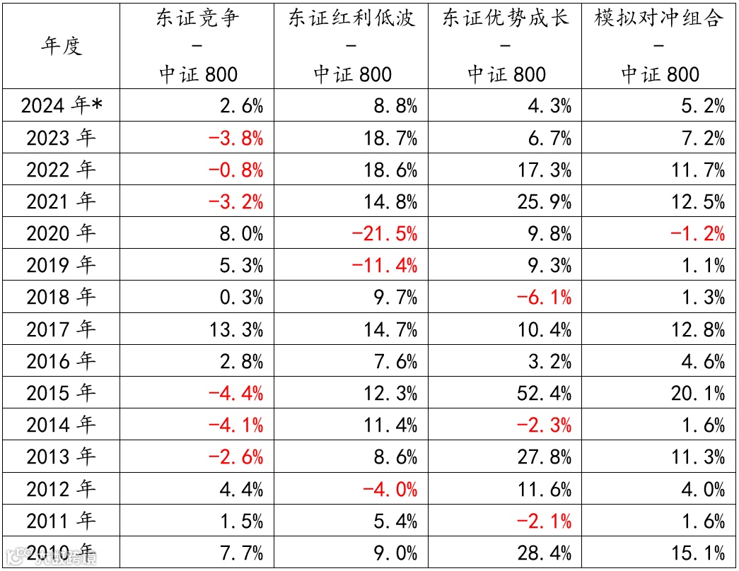 注:数据来自Wind,模拟对冲组合为年初以3条指数为标的进行等权配置,其中2024年数据截至3月底,中证800代码为000906。前瞻性陈述具有不确定性风险,不代表任何投资意见或建议,本公司不对任何依赖于该内容而采取的行为所导致的任何后果承担责任。