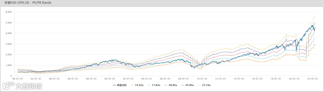 (图三:美国标普500指数上市以来PE(TTM) Band)