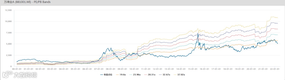 (图四:万得全A指数上市以来PE(TTM) Band)