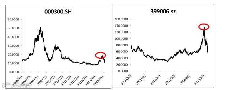 沪深300在6月中旬估值接近20倍,虽然此等水平并不算离谱,但是仍然处于近几年来相对较高位置;一度疯狂的创业板指估值更是达到历史性的140倍左右。高企的估值是本轮调整的估值背景。
