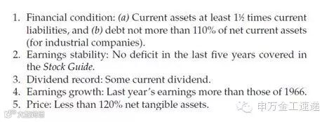 格雷厄姆在其著作《聪明的投资者》第七章“积极型投资者的证券组合策略”中提出了适用于“积极型投资者”的六条选股标准,再加入对PE的限制(书中的基础准则)之后,构成了企业主投资法的七大准则。