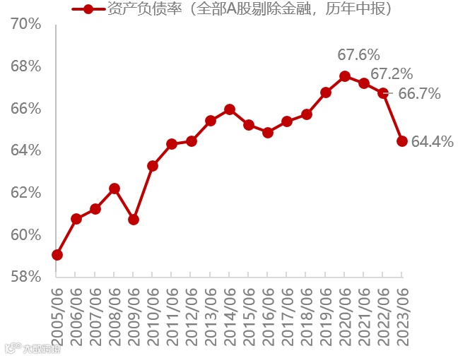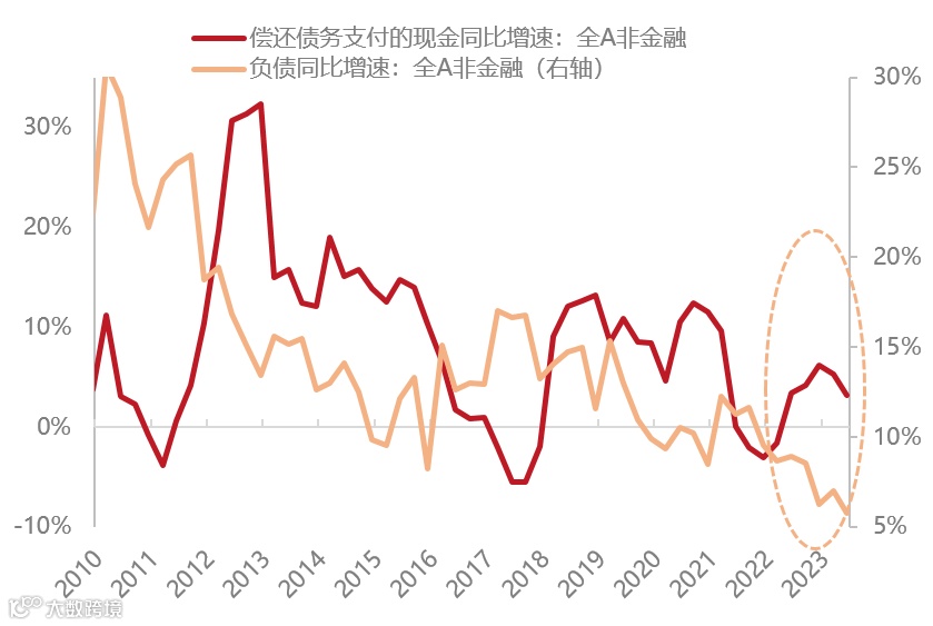 中长期来看,主要聚焦两个方面。一是中国房地产供求关系发生重大变化。从刚需角度来看,中国“买房主力”(25-49岁主力购房人口)自2015年以来已不断下滑,同时城镇化率已超过60%,海外经验显示60%~70%左右是城镇化率的瓶颈,意味着地产刚需增长可能受限。从改善性或投机性需求来看,由于受资产价格影响较大,投机性需求长期可能也将下降。二是部分私人部门信心不足,资产负债表修复是慢变量。收入预期放缓使得消费支出增速中枢下降,居民消费意愿仍未回到疫情前水平,近两年都出现储蓄高增长的现象。2022年住户存款新增17.8万亿;2023年截至8月新增11.9万亿,已超过去年同期。企业端,A股上市公司对应行业中相对优质或头部的企业,其中非金融企业偿还债务支付的现金流上升,负债同比增速下行,整体呈现为资产负债率下行幅度加大,指向企业选择“收缩战线”。