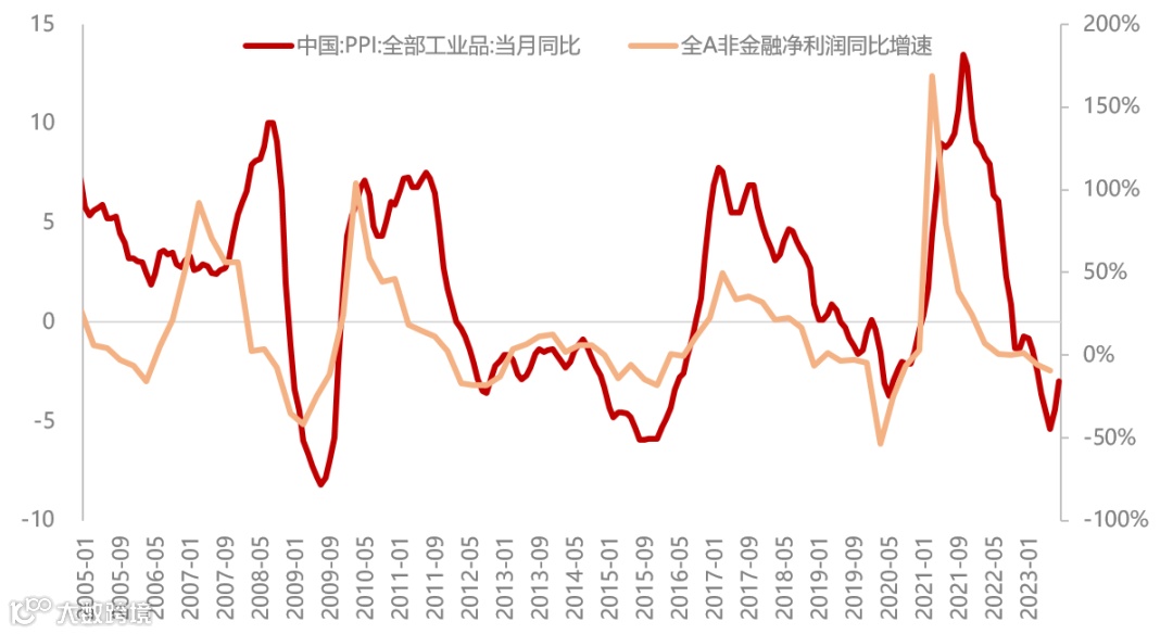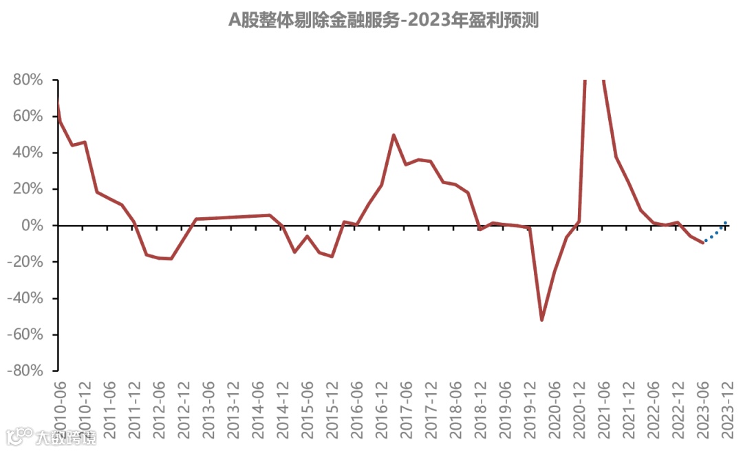 从历史上多轮盈利周期来看,上市公司盈利增速与PPI走势呈现高度一致性,A股非金融的“盈利底”与PPI底部基本同步出现,本轮PPI已经在7-8月出现拐头迹象,企业盈利也有望触底回升。2023年中报全A非金融盈利同比下滑9.5%,大概率确认“盈利低点”。中性假设下,根据历史环比季节规律推算,预计下半年A股盈利将跟随名义GDP的趋势回暖,2023年A股剔除金融全年盈利增速回升至低个位数。