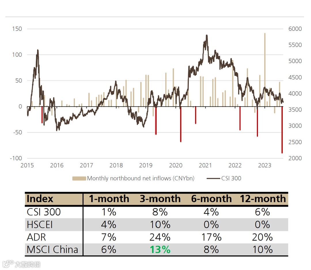 8月A股再现外资大量流出,北向资金单月净卖出897亿元,创单月净卖出额新高,此前记录是2020年3月的679亿。但外资可能是后知后觉的,过去在如此大规模的月度流出后的三个月内,从沪深300指数来看,A股平均回报率为8%。