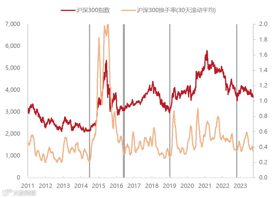 换手率是投资者情绪和市场活跃度的重要体现,对市场顶部/底部有一定的指示意义。从历史经验来看,在市场底部区域,成交量往往非常清淡,沪深300的日均换手率在0.3%左右,当前9月的日均换手率为0.31%。
