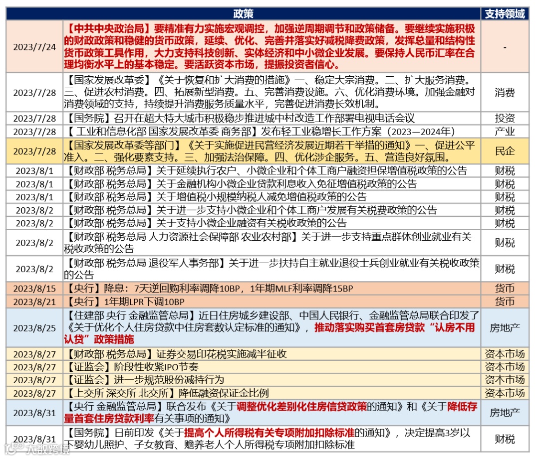 政策的不断支持对市场有下行保护。7月政治局会议标志政策拐点的出现,有利于大幅降低系统性风险,也为经济企稳回升和资本市场优化改善奠定了基础。债券利率已经领先于股市开启反弹。