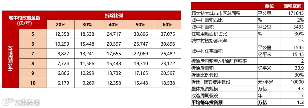 7月底政策提出“在超大特大城市积极稳步推进城中村改造”。根据估算,假设21个超大特大城市的城中村拆除比例为30%,假设建设周期为7-10年,则平均单年投资额可能在9000亿~1.3万亿。变数则在于中央层面对于“城中村”的广义财政支持。城中村改造金额对建筑面积、拆除比例和改造周期等参数都很敏感,且最终都取决于资金。参考2015-2017年棚改,中央层面的广义财政对于“城中村改造”的支持力度对拉动效应至关重要。