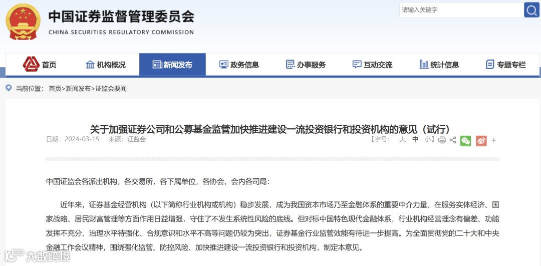 3月15日,证监会发布《关于加强证券公司和公募基金监管 加快推进建设一流投资银行和投资机构的意见(试行)》(下称《意见》)这一重磅文件,不仅明确了加快推进建设一流投资银行和投资机构的路线图,也将成为未来一段时期加强证券基金机构监管、促进行业高质量发展的指导性文件。