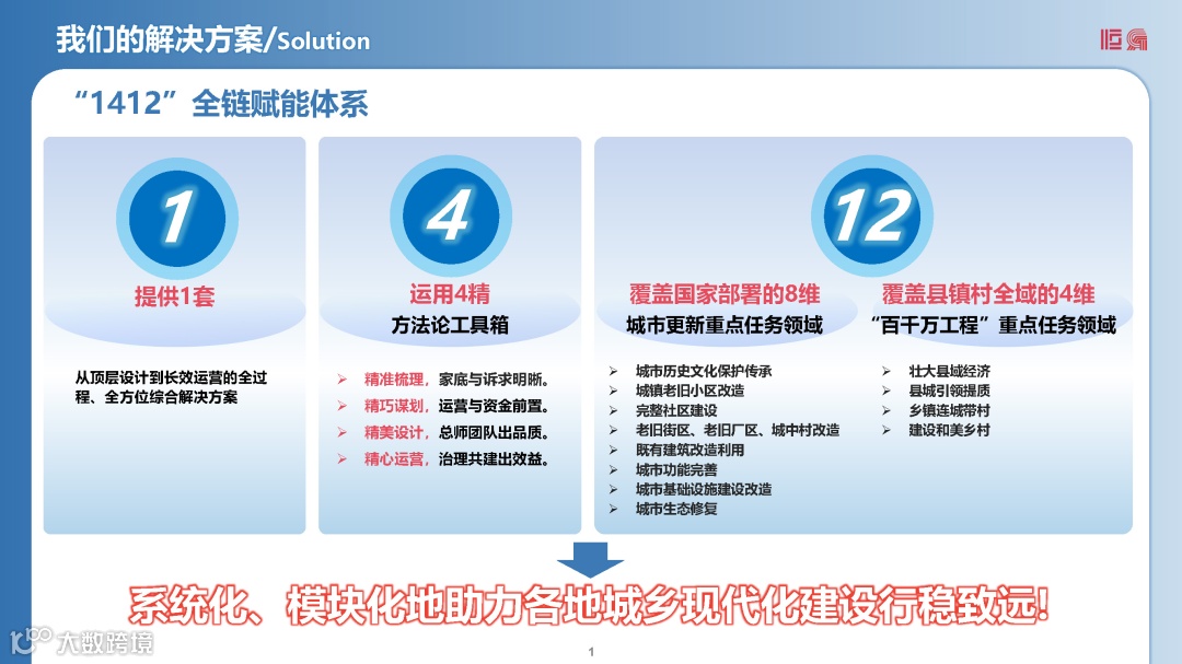 头痛医头,脚痛医脚,治不好城乡发展的沉疴痼疾。广东省建院创新提出的“1412”全链赋能体系,正是对症下药的“系统良方”。以1套从顶层设计到长效运营的全过程、全方位的综合解决方案为核心,运用“精准梳理、精巧谋划、精美设计、精心运营”的4精方法论,全面覆盖国家城市更新行动的8大维度与“百千万工程”县镇村全域4大维度。这一体系将碎片化的政策理解转化为系统的项目谋划,将模糊的现状底数转化为清晰的行动清单,让资金困局变为多元融资的通途,为城乡高质量发展提供了一体化、可落地的专业支撑。