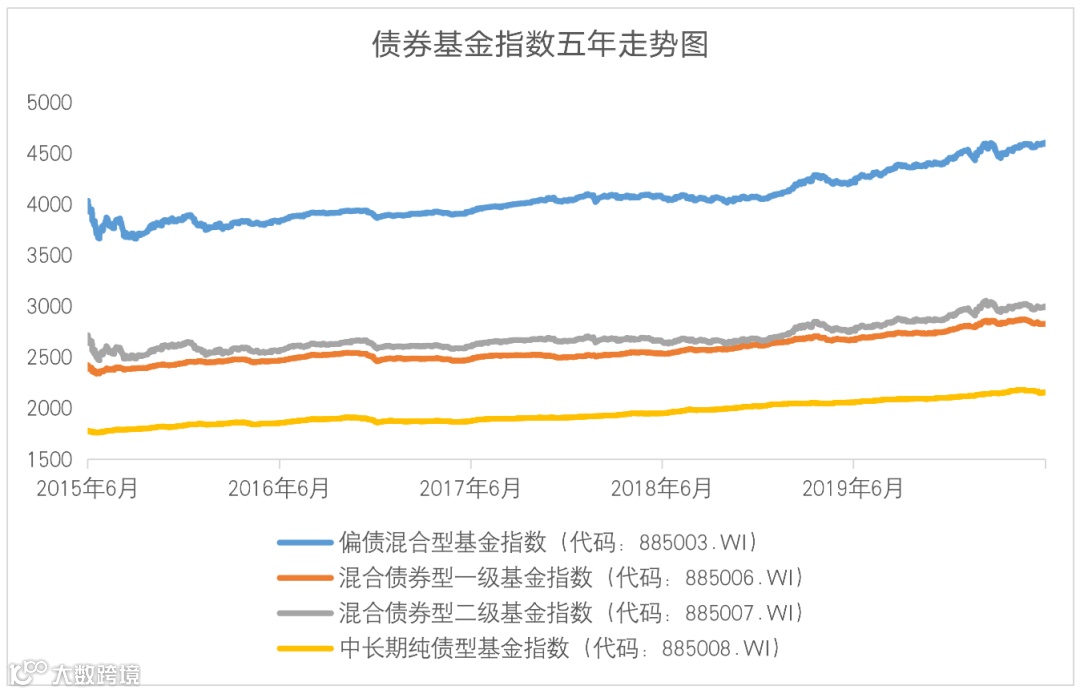 从一组基金指数来看,2015年6月17日至2020年6月16日,总体上,各种债券型和偏债混合型基金指数呈现稳步上升态势。