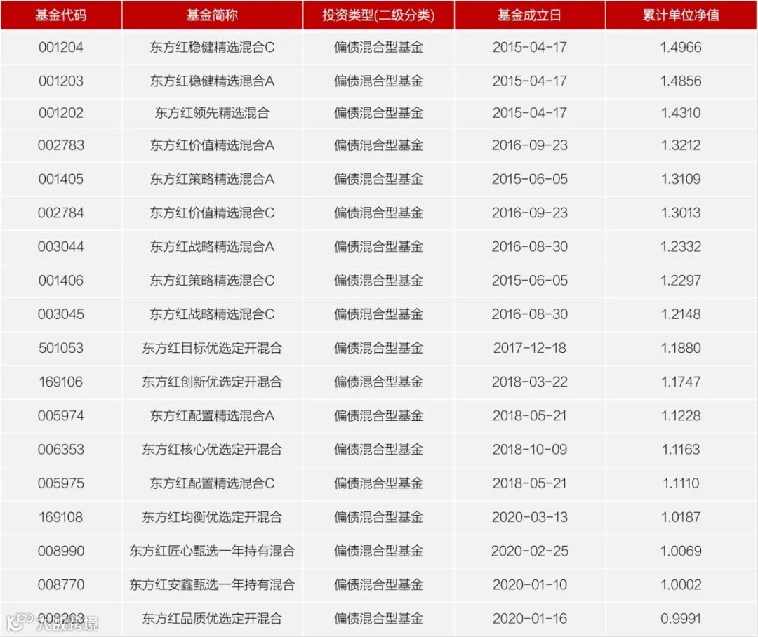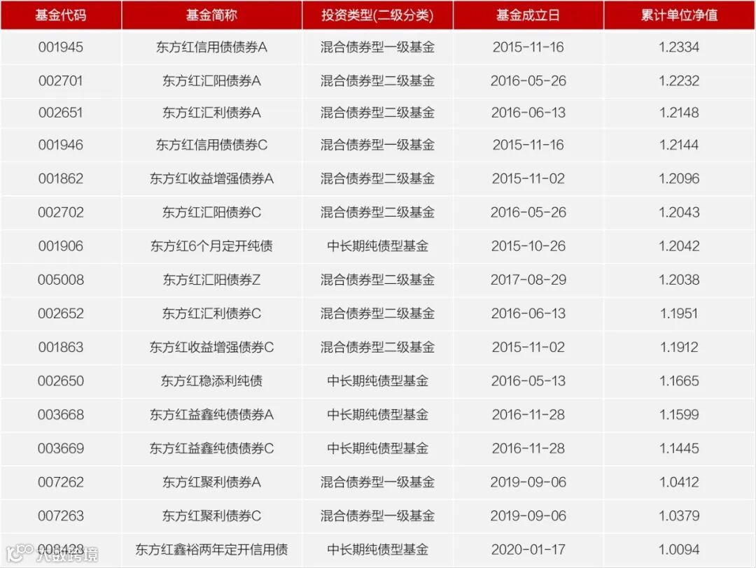 东方红资产管理旗下债券型以及偏债混合型基金成立以来累计单位净值: