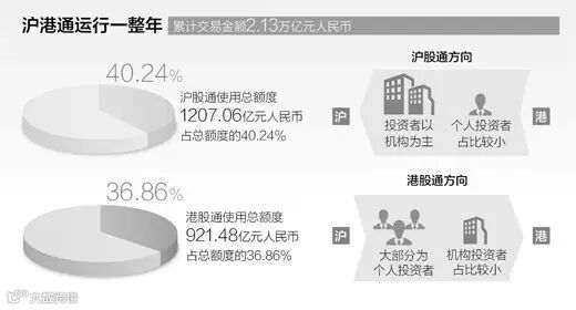 截至2015年11月16日,沪港通累计交易金额2.13万亿元人民币。其中,沪股通共230个交易日,交易金额1.54万亿元人民币,累计使用总额度1207.06亿元人民币,占总额度的40.24%。港股通共225个交易日,交易金额5898.60亿元人民币,累计使用总额度921.48亿元人民币,占总额度的36.86%。
