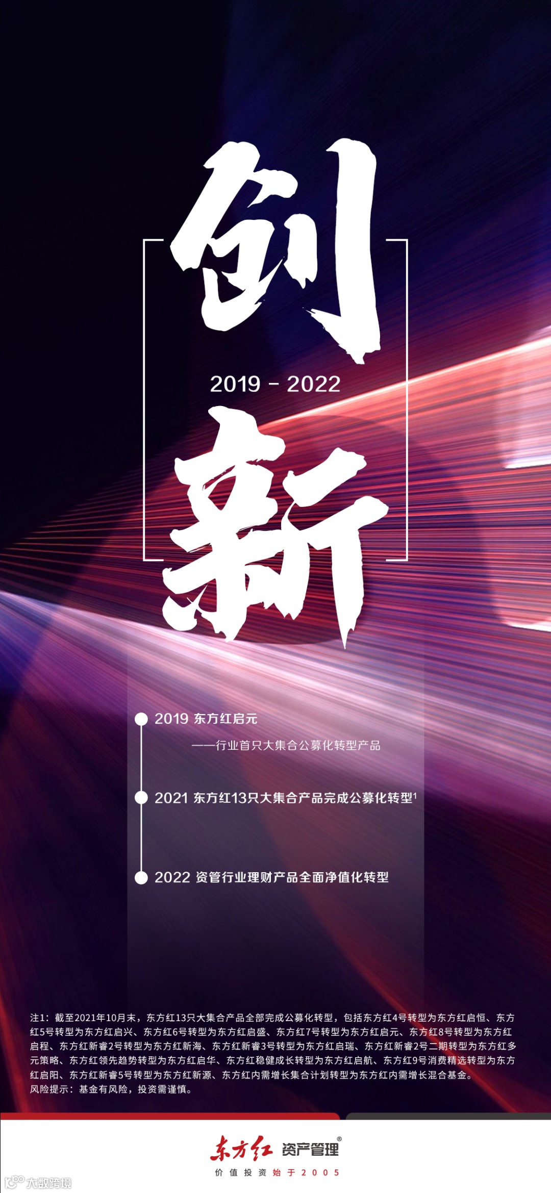 注2:截至2021年10月末,东方红13只大集合产品全部完成公募化转型,包括东方红4号转型为东方红启恒、东方红5号转型为东方红启兴、东方红6号转型为东方红启盛、东方红7号转型为东方红启元、东方红8号转型为东方红启程、东方红新睿2号转型为东方红新海、东方红新睿3号转型为东方红启瑞、东方红新睿2号二期转型为东方红多元策略、东方红领先趋势转型为东方红启华、东方红稳健成长转型为东方红启航、东方红9号消费精选转型为东方红启阳、东方红新睿5号转型为东方红新源、东方红内需增长集合计划转型为东方红内需增长混合基金。