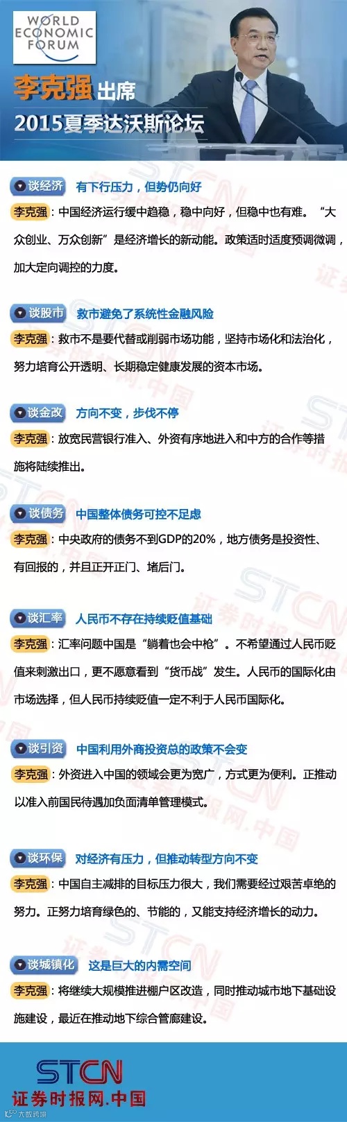 2015年夏季达沃斯论坛于本月9号至11号在中国大连举行。9日下午17:00,国务院总理李克强会见参加达沃斯论坛的中外企业家代表,并回答中外企业家的提问。在谈话中,李克强总理对目前股市波动、人民币贬值、经济下行等问题进行了精辟解答。
