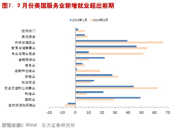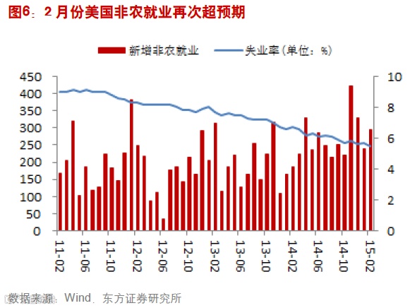 2月份美国非农就业新增25.2万人,远好于预期。目前美国非农数据已连续12个月增幅超过20万,是近十年来最强升势。分项数据中,休闲与酒店行业、贸易交通和公告事业、教育与健康事业以及教育与健康事业的新增就业超过1月份,显然2月份美国服务业的就业表现强劲。另外,2月份美国失业率为5.5%,较前期下降0.2%,劳动参与率提高了0.1%。与此同时,私人非农企业全部员工的平均时薪环比上升0.12%,较1月份下降0.41%。虽然2月份美国PMI数据低于预期,但是实际上美国经济状况还是好于预期。非农数据意味美国经济的强劲增长,联储加息时点可能会早于预期。
