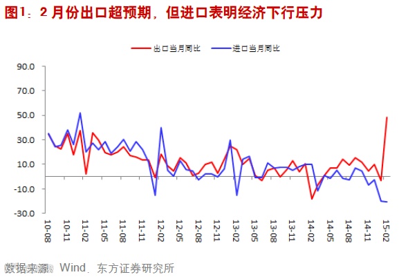 周日海关总署公布贸易数据显示,2月份出口增长48.3%,进口则大幅下降20.5%,顺差再次创历史新高达606.2亿美元。我们过去认为1月份是否是季节性因素导致进口大幅下滑,不过,从2月份进口数据的变动情况来,基本能够证实内需下行压力超过预期。从1-2月份进口总额来看,同比数据也进一步下降20.2%。目前的情况来看,出口明显好于预期。1-2月份的出口大幅提高至15.1%。出口的改善能够为经济下行提供支撑。然而,海外经济的复苏还存在不确定性。贸易还需要进一步观察,至少经济新常态并不是依靠传统贸易模式。