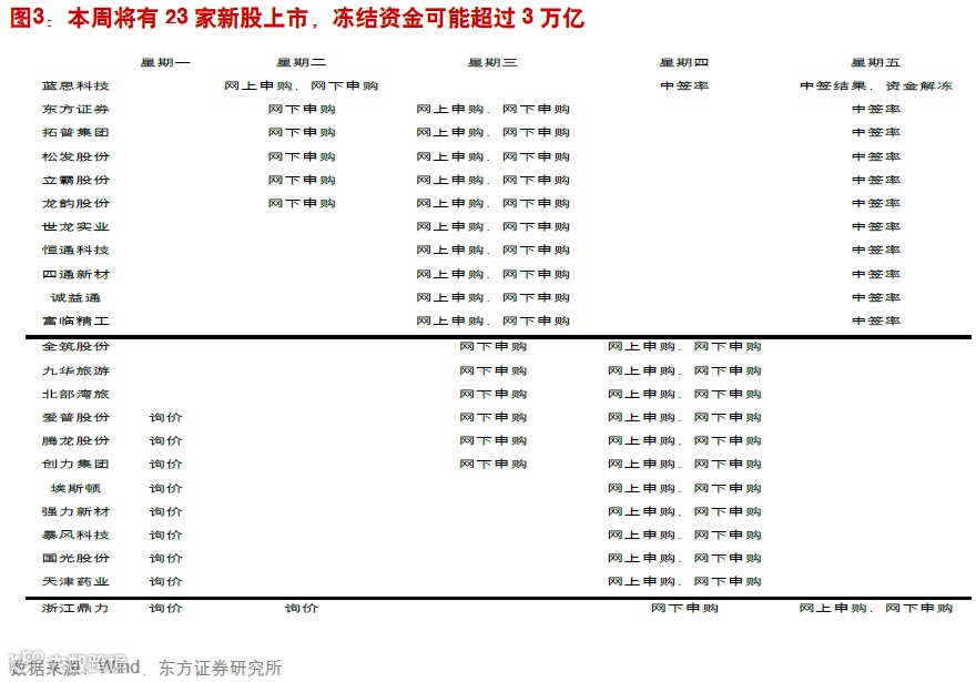 本周新股上市大约冻结资金可能会超过3万亿。从时间来看,周三和周四是新股上市最为集中的两天。周五则资金开始解冻。因此,我们认为创业板的回调很可能是短期的。至于市场担心创业板存在巨大泡沫,我们认为此时需要享受泡沫。实际上,创业板的泡沫并未到不可持续时候。当前市场对创业板的泡沫担忧大都集中在创业板与主板的估值比较以及与2000年纳指高点时的对比。但我们需要看到的是中国创业板缺少2000年时期的指数和估值,故无法猜想纳指最高点时期创业板可能的高点。不过,如果中国当时存在创业板,我们估计创业板的位置可能也是目前高点。当前纳指目前再次接近历史高点,这表明纳指引领全球的科技股重新走向新的高点,这个时期中国创业板不断创新高也并非是特例。如果创业板泡沫到了不可持续的话,那么我们可能要看到纳指泡沫的破裂,但这个时候我们还看不到纳指泡沫的破裂。所以,当前创业板的泡沫还未到破灭的时候。