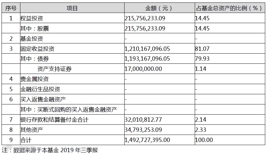 从2019年三季度的投资情况来看,固收资产占基金资产的81.07%,而股票投资占基金总资产的14.45%。立足债市,兼顾股市,追求组合风险和收益的平衡。