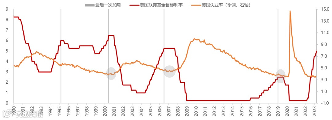 美联储加息结束后,可能会有一段过渡期,政策利率将维持高位。从最后一次加息到开启降息的过渡时间长短不定,过去四轮周期分别经历了6个月、8个月、15 个月、8 个月。因为最后一次加息时,通常劳动力市场仍然强劲,失业率处于低位,通胀水平见顶,美联储进入观察期。过渡期的长短将取决于经济转弱速度和风险暴露,比较有参考性的是2006-2007年,累计加息425bp至5.25%(跟此轮基本相当),总量数据掩盖了信贷环境的恶化,美联储仍担心通胀风险,因此经历了长达15个月的过渡期,直至金融危机爆发。
