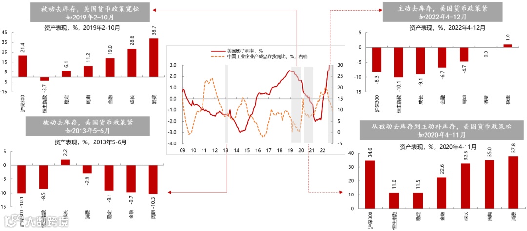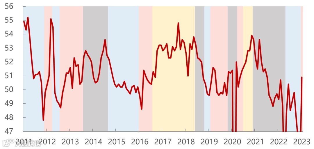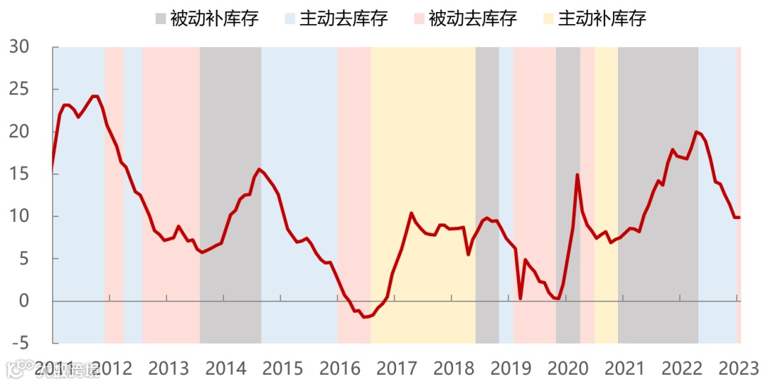 尽管当前仍处于去库存阶段,但中国库存周期将从“主动去库存”向“被动去库存”转换。2022年下半年处于主动去库存的阶段,表现为需求下降,企业主动减少生产,并降低库存;2023年制造业PMI分项中表征供需环境的新订单和生产均出现反弹,若需求改善快于生产,库存周期将向被动去库存切换。主动去库存往往对应经济衰退期,被动去库存阶段往往对应经济弱复苏。