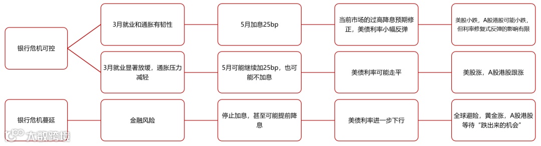 如果银行问题进一步恶化,出现类似“雷曼事件”的情形,美联储则可能向市场预期靠拢,提前转向,那么美债长、短端利率都有下行空间,市场可能先避险,待消化金融风险后上涨,对A股和港股来说可能都会出现一个机会。