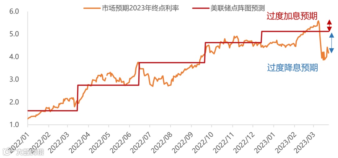 3月议息会议进一步确认美国加息周期接近尾声,美联储将“预计持续加息”的措辞调整为“一些额外的政策紧缩可能是适当的”,表述明显弱化,增加了未来暂停加息的灵活性。而波动来自市场预期的两极化移动,今年利率终点中位数维持在5.125%,对应年内还剩一次25bp加息的空间,降息仍然遥远。在这一点上,市场预期与美联储路径之间存在着较大的分歧,市场已经押注了下半年多达3次的降息预期。