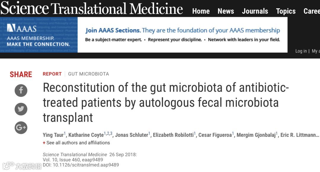 我们都知道抗生素的使用会导致肠道菌群的紊乱,菌群移植对于肠道菌群状态的恢复也是有帮助的。Science子刊最新报道 [9],患者在异基因造血干细胞移植(allo-HSCT)中接受常规抗生素治疗以减少感染,但同时也使肠道菌群多样性丧失。通过自体粪菌移植使患者菌群组成向治疗前的状态恢复,且耐受性良好。