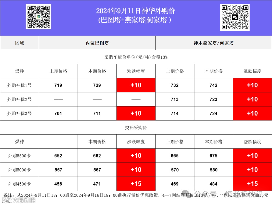 外购第二次补涨:从9月11日18时执行,外购4500涨15元/吨。其他所以煤种全部上涨10元/吨,价格联动政策继续执行。昨天调价信息作废。