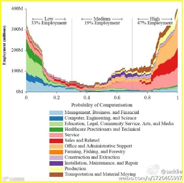 这是被奇点大学引用的一张未来就业图,未来二十年,会有将近一半的工作被自动化取代。需要创新和社交的岗位相对风险较小。