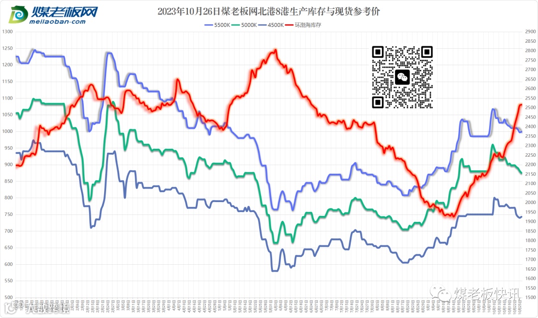 截止10月27日上午,据追踪的主流煤矿来看,价格变动煤矿约10家(含榆神、府谷、横山、内蒙),2家涨跌互现(籽、块煤上涨,面煤下跌),其余均下跌。榆阳、横山区域局部价格下跌,少部分煤矿全煤种单次降幅30元/吨,内蒙区域部分煤矿降价后煤车略增,降幅为5~50元不等,部分大矿一天三降,单一煤种累降达55元/吨,个别煤矿精煤单次降幅50元/吨,其中部分体量大的集运站销售较好,煤车排队现象明显。