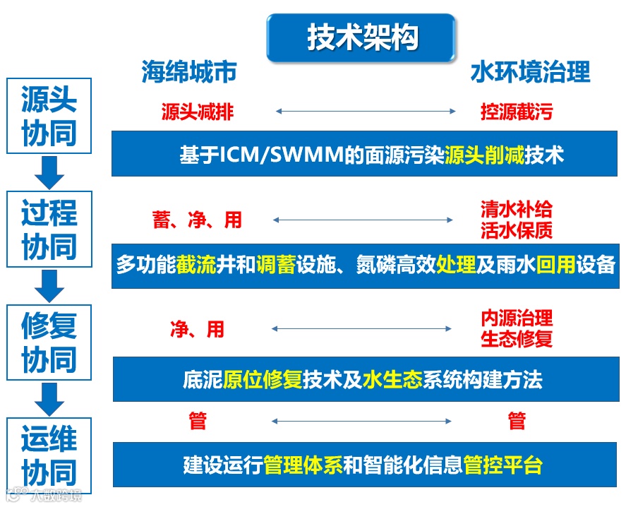 1.构建了海绵城市建设和水环境治理协同技术体系,从源头协同、过程协同、修复协同、运维协同开展全流程的协同技术研究。创新性地提出海绵城市建设与水环境治理相协同的技术方法。
