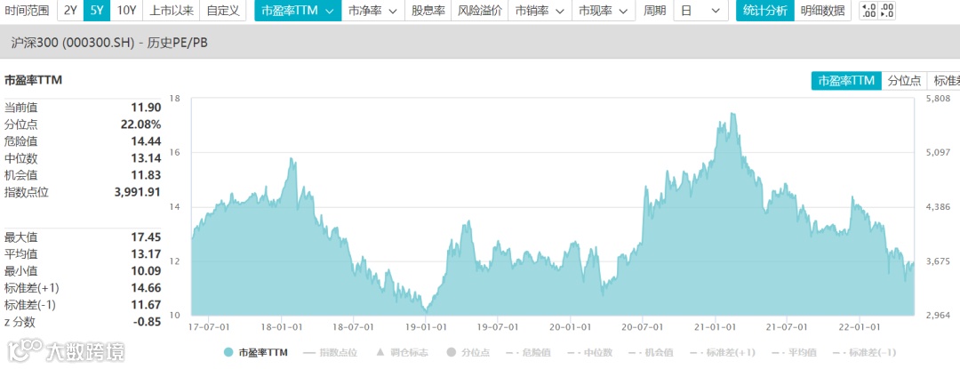 今年以来A股市场持续震荡,恐慌情绪蔓延,各大指数纷纷下跌,普通投资者避险情绪升温。但是,从估值的维度看,当前却是难得的布局良机。Wind数据显示,5月17日沪深300指数市盈率为11.90倍,低于最近5年13.17倍的平均值,并位居从低到高的22.08%的分位点,处于明显底部区域。