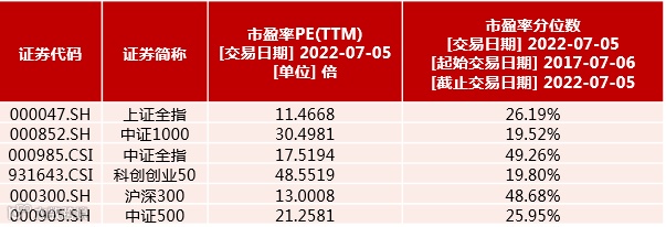 WIND数据显示,7月5日,沪深300指数、中证500指数、中证1000指数、科创创业50指数、中证全指、上证全指等指数市盈率均位居近五年的50%分位数以下。