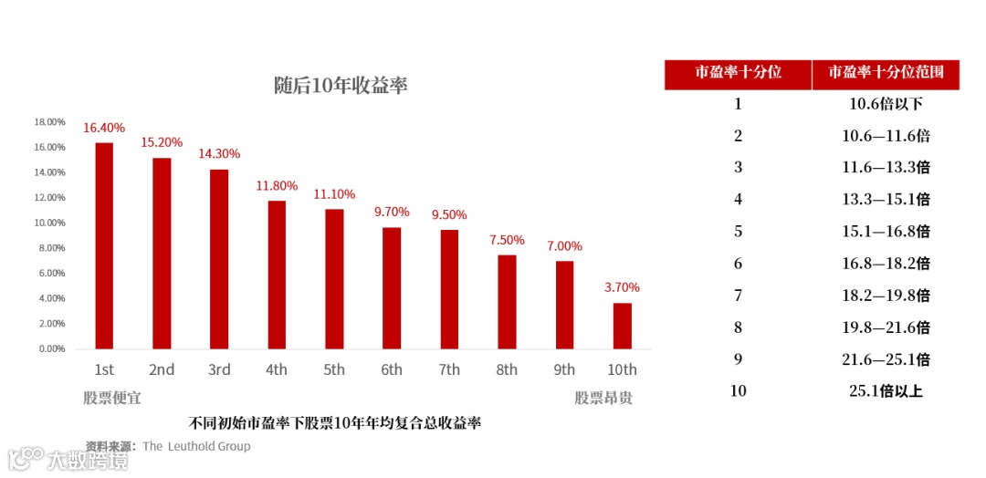 历史数据显示,同样一个市场中,越是在整体市盈率低的时候买,投资者未来平均收益率越高。伯顿G.马尔基尔在《漫步华尔街》中写道,计算美国股市从1926年以来每个季度的市盈率,然后计算每个季度之后10年的市场总收益,一直计算到2014年,对观察结果进行十分位划分。