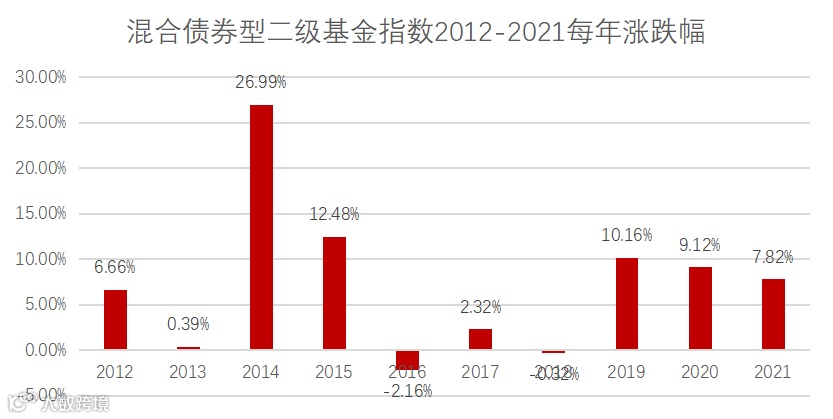 我们观察了2012—2021年混合债券型二级基金指数的表现,有8年为正收益,仅有2016年和2018年股市表现较弱的年份,出现小幅下跌。在2014年-2015年股债双牛的行情下,混合债券型二级基金指数年度涨幅分别达到26.99%和12.48%,2019年—2021年,股市出现了结构性机会,二级债基每年都有较为稳健的正收益。