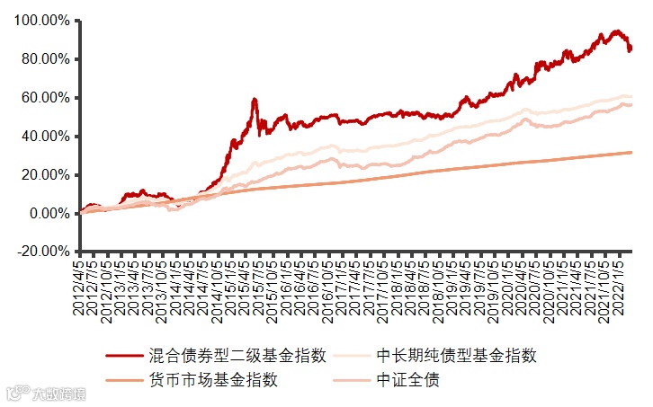 二级债基在稳住底盘的基础上,展现出一定的上行收益弹性,成为穿越牛熊市的“固收+”产品,受到市场的追捧。从wind基金指数来看,长期而言,混合债券型二级基金指数长期业绩表现优于中长期纯债基金指数、货币基金指数及中证全债指数。