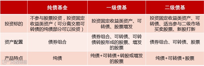 目前国内基金市场上的主动管理的债券型基金,根据其投资范围可以分为纯债债基、一级债基、二级债基。