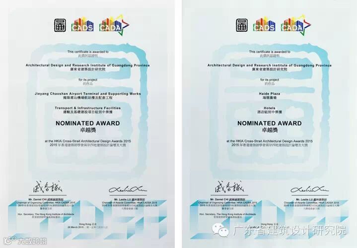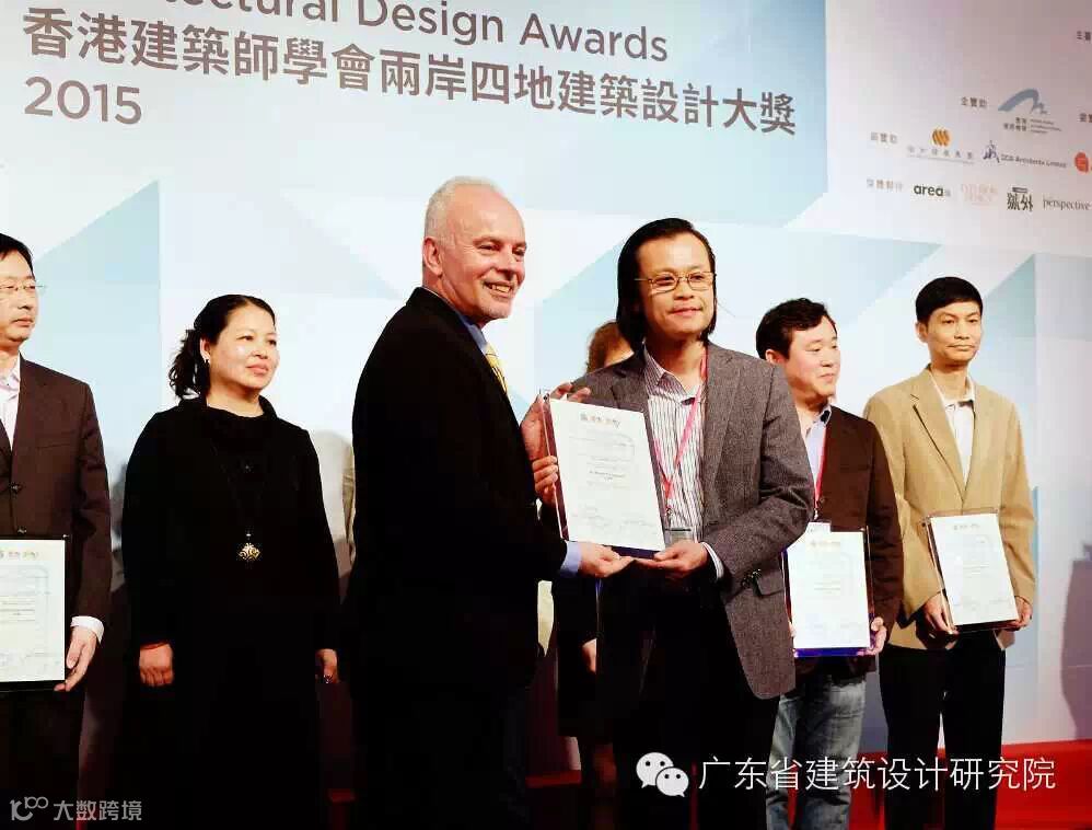 由香港建筑师学会主办、香港特别行政区(特区)政府“创意香港”赞助的“2015年香港建筑师学会两岸四地建筑设计论坛及大奖”,于2015年3月28日在香港JW万豪酒店成功举办。我院海德广场和潮汕机场两个项目分别荣获“2015年两岸四地建筑设计卓越奖”,我院总建筑师陈雄、ADG·机场院总建筑师潘勇分别代表我院上台领奖。