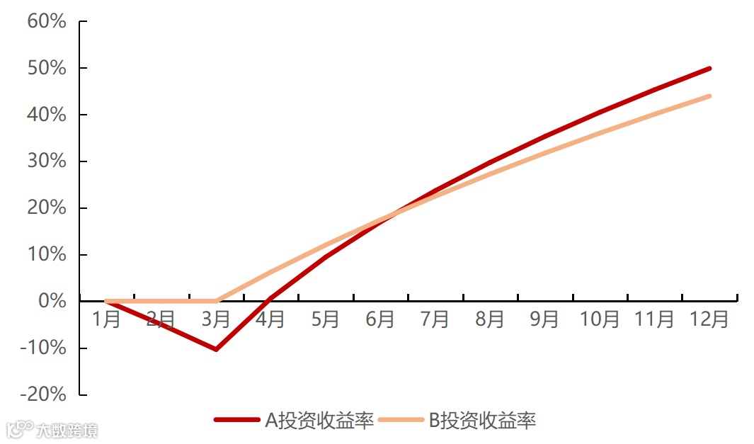 A投资者从1月就开始投资,每月定投1000元;而B投资者在观望了两个月后,终于在3月迈出了定投的步伐,每月定投1200元。