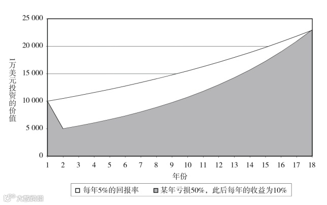 如果你第一年亏了50%,后续即使每年10%的收益要追上每年稳健5%的市场收益,需要花16年。