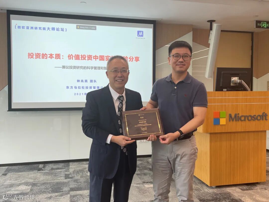 2021年7月1日,微软亚洲研究院特邀东方马拉松投资管理公司董事长钟兆民先生出席该院 “大师论坛”,并就论坛主题“投资管理与人工智能融合”发表了主题演讲:《投资的本质:价值投资中国实践经验分享——兼议投资研究的科学管理和智能需求》,这是一场别具匠心的跨界分享,与微软亚洲研究院“创新汇”提倡的跨界共创精神高度契合,线上线下近四百名听众全程参与,互动异常激烈,头脑风暴精彩纷呈,原计划一个半小时演讲,持续了三个半小时。据悉,钟兆民先生为微软亚洲研究院“大师论坛”邀请的首位投资界专业人士。