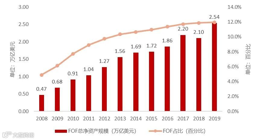 图表:2008年-2019年美国FOF总规模及市场规模占比
